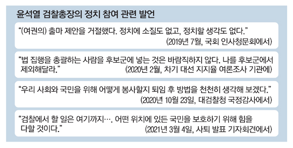 여당이 재보선을 고려해 최근 검찰 개혁 속도조절론을 공언한 상황에서 윤 총장이 사퇴를 서두른 게 이해할 수 없다는 반응도 많았다. 한 상임위원회 여당 간사는 "재보선까지 정부·여당에서 중대범죄수사청(중수청) 관련 언급을 자제할 텐데 윤 총장 혼자 벽에 대고 중수청을 막아야 한다고 떠들게 됐다"고 말했다. 여당 전략통 의원은 "재보선 전에 정치에 등판하면서 오세훈·안철수 서울시장 후보보다 윤 총장이 더 주목을 받는 상황이 됐다"며 "윤 총장이 이들을 지지하면 향후 재보선 공동 책임론을 떠안게 되고, 침묵하면 보수 진영으로부터 대권 주자인데 왜 가만히 있느냐는 비판이 쏟아질 것"이라고 말했다. 이어 "윤 총장이 보수층 결집 효과는 있겠지만 중도 확장 능력은 검증되지 않아 보수 야권에 유리한 건지 의문"이라고 덧붙였다.