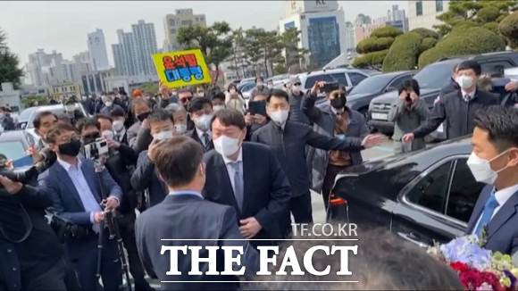 [더팩트ㅣ대구=박성원 기자] 대구시의회 더불어민주당 시의원들이 3일 대구검찰청을 방문한 윤석열 총장에게 환영 꽃다발을 준 권영진 대구시장은 사과해야 한다고 밝혔다.