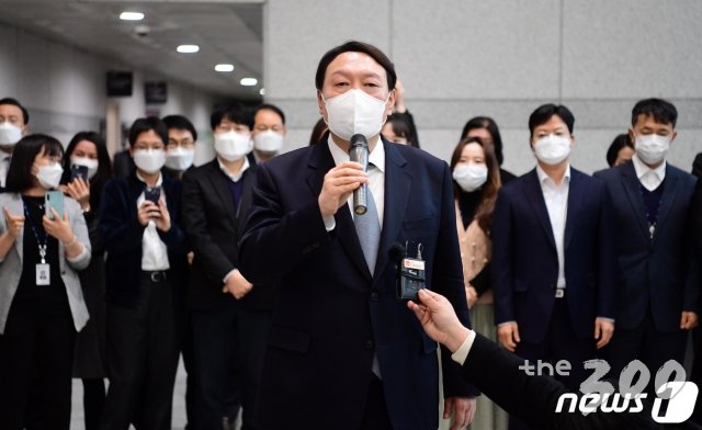 (서울=뉴스1) 오대일 기자 = 사의를 표명한 윤석열 검찰총장이 4일 오후 서울 서초구 대검찰청 청사를 나서며 직원들에게 인사말을 하고 있다. 2021.3.4/뉴스1 |