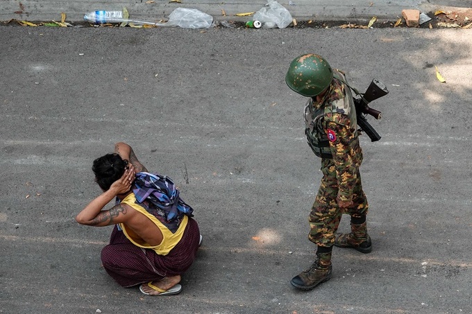 미얀마 제2의 도시 만달레이에서 지난 3일(현지시간) 연행된 군부 쿠데타 규탄 시위 참가자 곁에 총을 멘 군인이 서 있다. 만달레이 AFP=연합뉴스 |