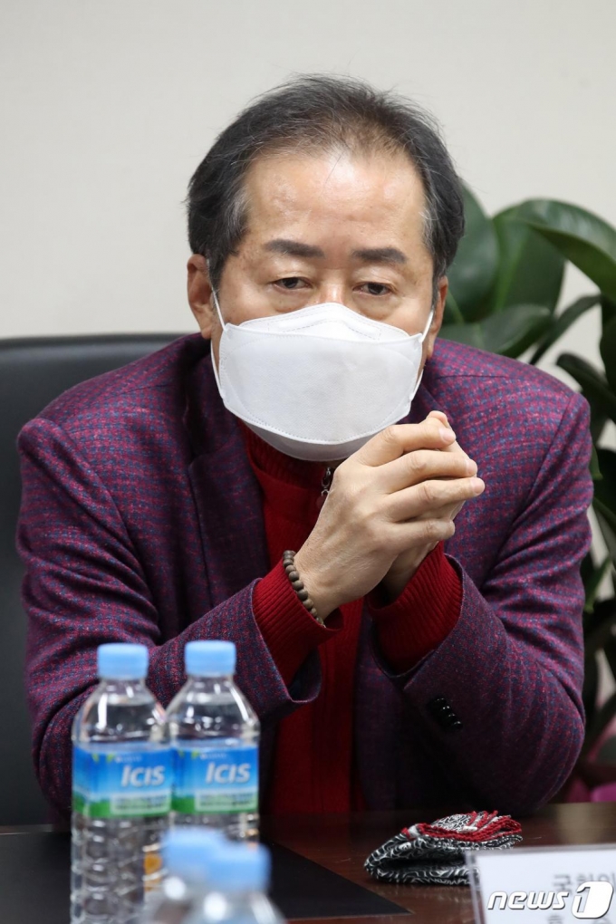 무소속 홍준표 의원이 5일 오후 대구 중구 서문시장 상가연합회 사무실을 찾아 상인들과 면담하고 있다./사진=뉴스1 |