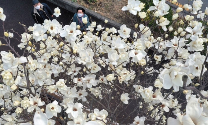 지난 7일 오후 경남 창원시 마산합포구 한 유치원 인근에 목련이 활짝 펴 시선을 끌고 있다. 창원=연합뉴스 |