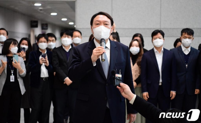 사의를 표명한 윤석열 검찰총장이 4일 오후 서울 서초구 대검찰청 청사를 나서며 직원들에게 인사말을 하고 있다./사진=뉴스1 |