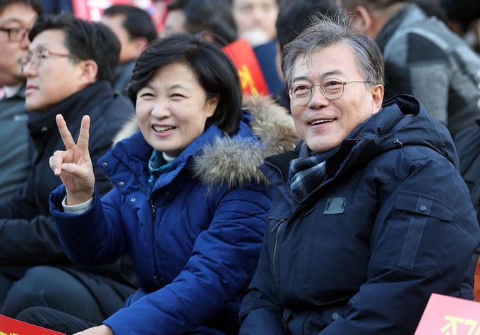 추미애 전 법무부 장관이 더불어민주당 대표이던 2017년 2월25일, 당시 대선주자인 문재인 대통령과 함께 서울 종로구 광화문에서 열린 제17차 박근혜 대통령 퇴진촉구 집회에 참석해 기념촬영을 하고 있다. 연합뉴스 |
