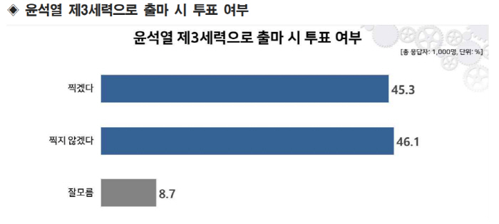 11일 오마이뉴스가 리얼미터에 의뢰해 조사한 결과(전국 만 18세 이상 남녀 대상, 최종응답 1000명, 응답률 7.4%, 신뢰수준95%, 표본오차 ±3.1%P )에 따르면 "윤 전 총장이 더불어민주당이나 국민의힘 후보가 아닌 다른 정당 또는 무소속 후보로 대통령선거로 출마하는 경우" 응답자의 45.3%가 "윤 전 총장을 찍겠다"고 답했다.