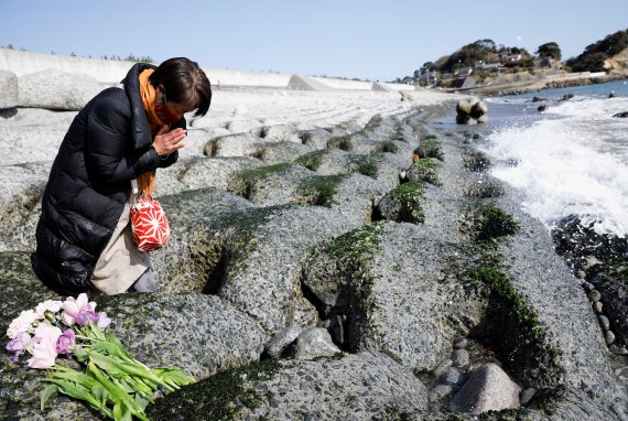 한 여성이 후쿠시마 이와키 해변에서 동일본대지진으로 희생된 이들을 추모하고 있다. 로이터 뉴스1 |