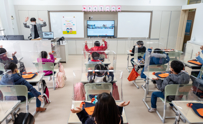 지난 2일 오전 서울 한 초등학교에서 첫 등교를 한 1학년 학생들이 화상으로 열린 입학식에서 인사하고 있다./연합뉴스 |