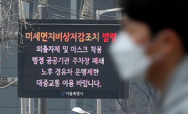 수도권 전역에 미세먼지 비상저감조치가 시행된 11일 서울 성동구 광나루로에 세워진 전광판에 저감조치 시행 안내문이 나오고 있다. 뉴시스 |