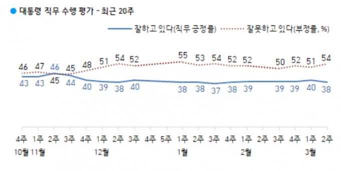12일 여론조사업체 한국갤럽이 발표한 3월 2주차(9~11일) 문 대통령 지지도 조사 결과에 따르면 '잘하고 있다'는 38%, '잘못하고 있다'는 54%로 나타났다.