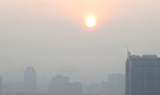 서울에 미세먼지 나쁨과 초미세먼지 매우 나쁨이 예보된 지난 11일 오전 서울 시내에서 건물들 위로 떠 오르는 아침 해의 주변이 미세먼지와 안개로 뿌옇게 번져 보인다. 연합뉴스 |
