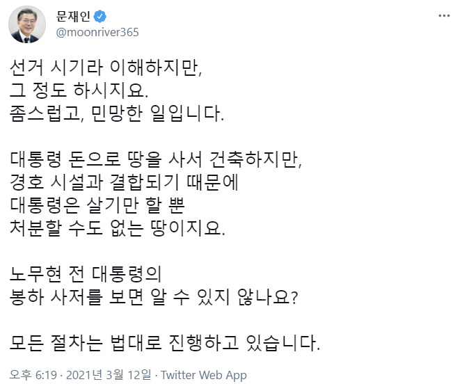 문 대통령은 "대통령 돈으로 땅을 사서 건축하지만, 경호시설과 결합되기 때문에 대통령은 살기만 할 뿐 처분할 수도 없는 땅"이라며 "노무현 전 대통령의 봉하 사저를 보면 알 수 있지 않나요?"라고 반문했다. 이어 "모든 절차는 법대로 진행"하고 있다고 강조했다.