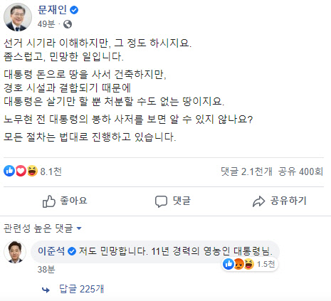 한편 이준석 전 미래통합당(현 국민의힘) 최고위원은 문 대통령의 SNS 글에 “저도 민망합니다. 11년 경력의 영농인 대통령님”이라고 댓글을 달았다.