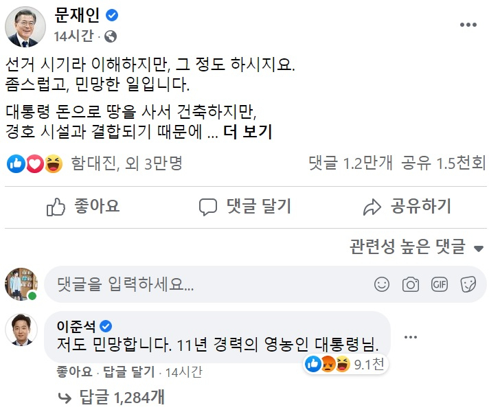 이준석 전 최고위원은 문 대통령의 페이스북 글에 직접 댓글을 달고 "저도 민망하다"며 "11년 경력의 영농인 대통령님"이라고 했다. 문 대통령이 해당 농지 취득 자격 증명서에 '영농 경력 11년'을 썼다는 것이다.