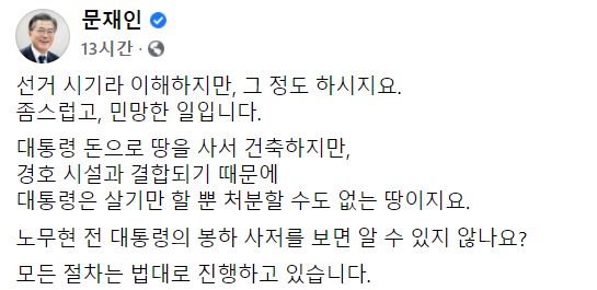 전날 문 대통령이 자신의 소셜미디어에 글을 올려 야권이 경남 양산 사저 부지를 문제 삼는 것은 "좀스럽고, 민망한 일"이라며 불쾌감을 드러낸 데 대해 반발한 것이이다.