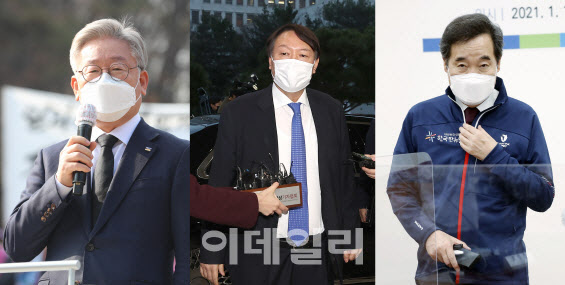 [이데일리 이준기 기자] 차기 대선후보가 여당인 더불어민주당의 이재명(사진 왼쪽) 경기도지사와 범(凡) 야권의 윤석열(가운데) 전 검찰총장의 ‘양강 구도’로 재편하는 분위기다. 한때 선두를 질주하던 이낙연(오른쪽) 민주당 대표 상임 선대위원장은 다소 밀려나는 모양새다.