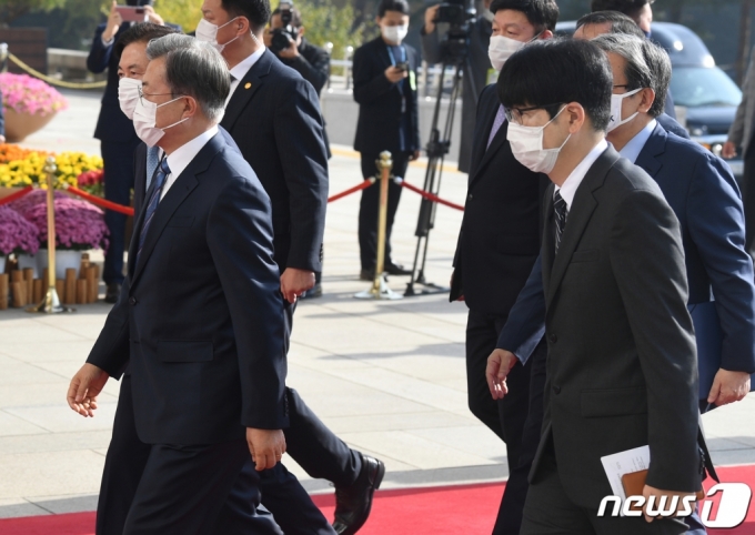 문재인 대통령이 2021년도 정부 예산안 처리를 위한 시정연설을 위해 28일 오전 서울 여의도 국회 본청으로 들어서는 가운데, 탁현민 청와대 의전비서관이 뒤를 따르고 있다. /사진=뉴스1 |
