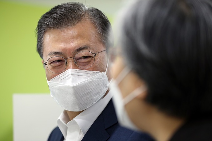 문재인 대통령이 국내 신종 코로나바이러스 감염증(코로나19) 예방백신 접종이 시작된 지난달 26일, 서울 마포구보건소를 방문해 접종대상자를 기다리며 정은경 질병관리청장과 대화하고 있다. 청와대는 문 대통령 내외가 오는 23일 아스트라제네카 백신을 접종한다고 15일 밝혔다. 연합뉴스 |