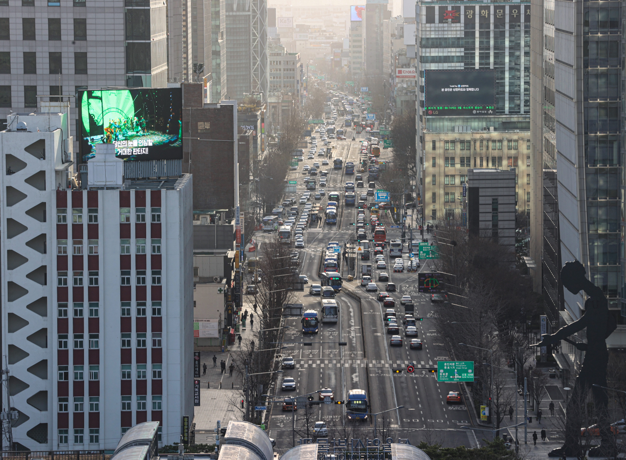 지난 밤 내린 봄비로 짙게 드리웠던 미세먼지가 사라진 16일 오전 서울 종로구 서울시교육청에서 바라본 광화문과 종로 일대가 전날보다 선명하게 보인다. 그러나 기상청은 이날 오후부터 중국발 황사의 영향으로 서해안을 시작으로 미세먼지 농도가 높아질 것으로 예보했다. [연합] |