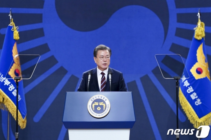 문재인 대통령이 12일 오후 충남 아산시 경찰대학에서 열린 2021년 신임경찰 경위·경감 임용식에 참석해 축사를 하고 있다. /사진=뉴스1 |