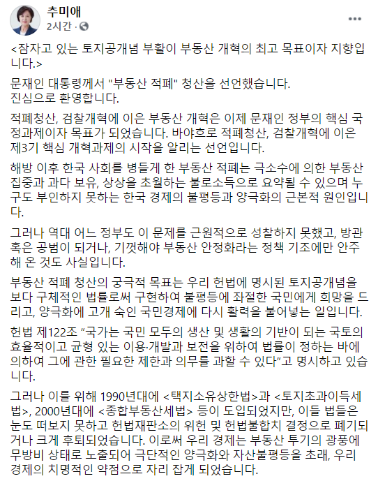 추 전 장관은 이날 자신의 페이스북에 '잠자고 있는 토지공개념 부활이 부동산 개혁의 최고 목표이자 지향입니다'라는 제목의 글을 올려 "문재인 대통령께서 '부동산 적폐' 청산을 선언했다. 진심으로 환영한다"라며 이같이 말했다.