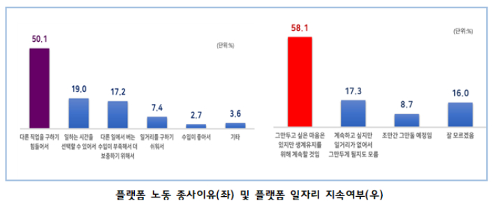 설문조사 대상자의 83.1%가 플랫폼 노동이 주업으로, 응답자의 절반이상은 코로나19 상황 등 전반적인 일자리 부족으로 다른 직업을 구하기 힘들어서 플랫폼 노동을 하고, 그만두고 싶지만 생계유지를 위해 플랫폼 노동을 이어간다고 답했다.