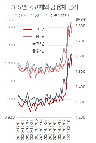 여기에 국회에서 논의 중인 2021년도 1차 추가경정예산(추경)안은 9조9000원 규모의 추가 국채발행 계획을 담고 있다. 시장에 국채 공급이 늘어나면 국채 가격은 떨어진다. 국채 수익률인 금리는 가격과 역의 관계다.