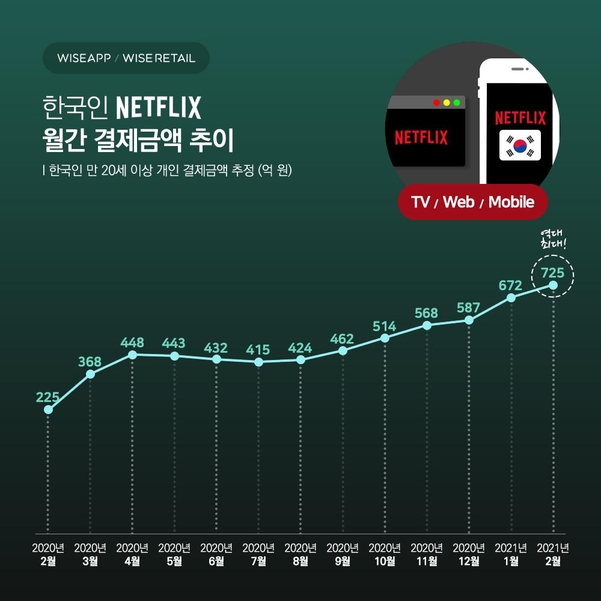 국내 온라인동영상서비스(OTT) 시장을 장악하고 있는 넷플릭스가 매달 역대 유료결제액 기록을 갈아치우고 있다. 지난 2월 한 달간 725억원을 벌어들이며 사상 최대치를 기록했다.