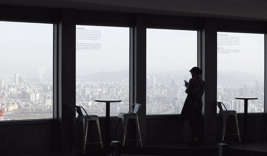 중국발 황사가 예보된 16일 오후 N서울타워 전망대에서 한 종업원이 창밖을 보고 있다. 기상청은 지난 14∼15일 중국 내몽골고원과 고비사막 부근에서 황사가 발원해 북풍을 타고 남하하면서 이날 우리나라 전국에 영향을 끼친다고 밝혔다. [연합] |