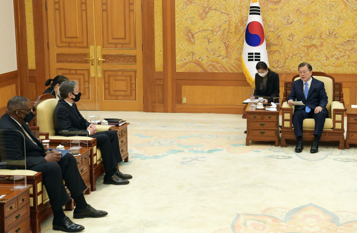 문 대통령이 지난 1월20일 출범한 조 바이든 행정부의 고위급 인사를 만난 것은 처음이다. 앞서 블링컨 장관과 오스틴 장관은 외교부 청사에서 양국 외교·국방 장관이 참여하는 ‘2+2’ 회의 및 한·미 방위비분담특별협정 가서명식에 참석했다.