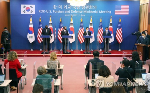관영 중국중앙TV(CCTV)는 정의용 외교부 장관, 서욱 국방부 장관이 이날 서울에서 미국 토니 블링컨 국무장관, 로이드 오스틴 국방장관과 '2+2 회의'를 통해 한미 동맹과 북핵 문제 등 국제 의제에 대해 의견을 교환했다며 신속 보도했다.