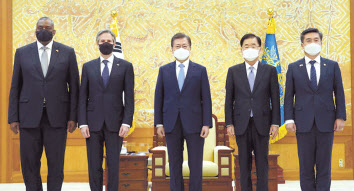 문 대통령은 전날 오후 청와대에서 미국의 토니 블링컨 국무장관과 로이드 오스틴 국방장관을 접견했다. 두 장관은 2+2 회의에서 한미 공동성명을 발표한 뒤 청와대를 찾았다. 문 대통령이 바이든 행정부 출범 이후 처음으로 미측 고위급인사를 만나는 이 자리는 상견례 성격이 강했다. ‘한반도 비핵화’와 ‘북한 비핵화’ 표현 사이 미묘한 여운을 남긴 북핵문제와 관련해선 양국이 소통하자는 원론적 이야기에 그쳤다. 한국의 사실상 반중연대인 쿼드(Quad) 참여 문제와 북한 인권문제 등 민감한 사안에 대한 언급도 없었다.