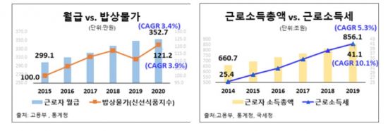 2014년부터 2019년까지 근로소득세 결정세액(실제로 낸 세금)은 2014년 25조4000억원에서 2019년 41조1000억원으로 연평균 10.1% 증가했다. 이는 근로자 소득이 2014년 660조7000억원에서 2019년 856조1000억원으로 연평균 5.3%증가한 것에 비해 2배 가까이 높은 수준이다.