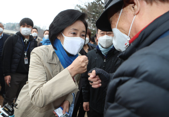 박영선 더불어민주당 서울시장 후보가 21일 서울 중구 ‘한양도성 순성길’에서 열린 ‘탄소중립위원회 출범식 참석을 마친 뒤 시민과 인사하고 있다.(사진=연합뉴스) |