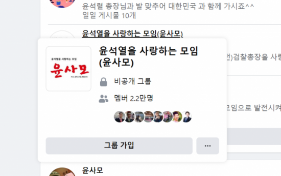 페이스북을 기반으로 활동하고 있는 '윤사모' 가입 멤버는 21일 기준 2만2천 명이다. 모임 검색은 누구나 가능하지만, 게시글과 공유 사진, 글 등은 비공개라 멤버만 볼 수 있다.