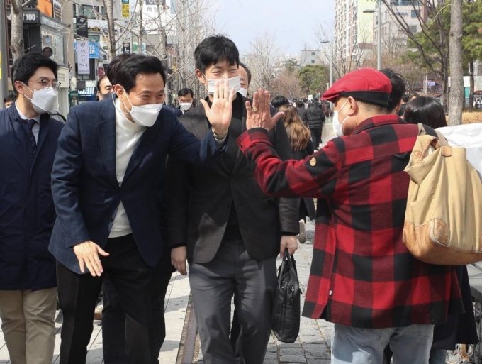 오세훈 국민의힘 서울시장 후보가 21일 오후 서울 마포구 경의선숲길을 방문해 시민들과 인사하고 있다./사진=뉴시스 |