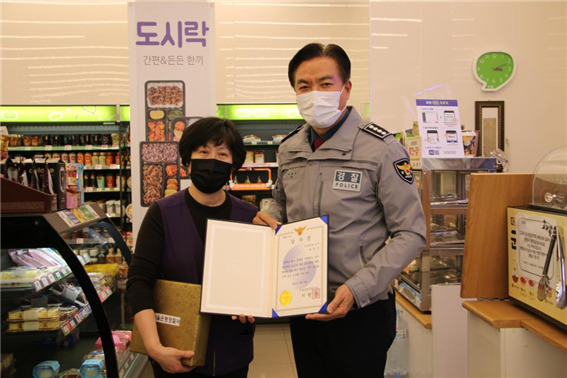 지난 18일 보이스피싱 피해를 막은 서울 은평구 불광동의 한 편의점주에게 이원준(오른쪽) 서울 은평경찰서장이 감사장을 전달하고 있다. [은평경찰서 제공] |