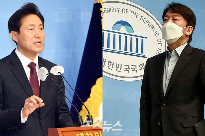 왼쪽부터 국민의힘 오세훈 서울시장 후보‧국민의당 안철수 서울시장 후보. 윤창원 기자 |