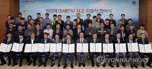 (울산=연합뉴스) 김용태 기자 = 울산시는 낙동강유역환경청, 지역 민간 기업체 30개 사와 2018년 체결한 '미세먼지 저감을 위한 자발적 협약'이 지역 대기 오염 저감에 기여하고 있다고 23일 밝혔다.