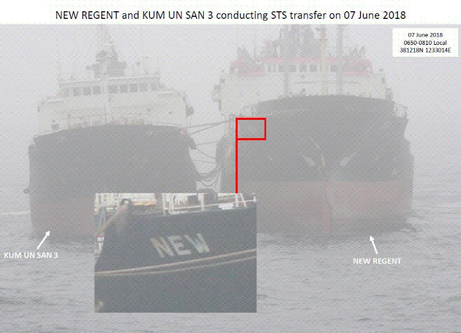 북한의 불법적인 정제 석유 밀수입에 관여한 기업과 개인, 그리고 선박의 경로 일부가 미국 일간지 뉴욕타임스(NYT)의 탐사보도로 밝혀졌다. 사진은 미국 국무부 국제안보비확산국(ISN)이 2018년 10월 26일 트위터를 통해 북한 선박들이 3차례에 걸쳐 유류로 추정되는 물품을 불법 환적(옮겨싣기)하고 있다고 공개한 현장 사진 9장 가운데 6월 7일 파나마 선적 뉴리젠트(NEW REGENT)호와 북한 유조선 금운산(KUM UN SAN) 3호가 여러 개의 호스를 사용해 환적하는 모습./사진=국무부 ISN 트위터 캡처 |