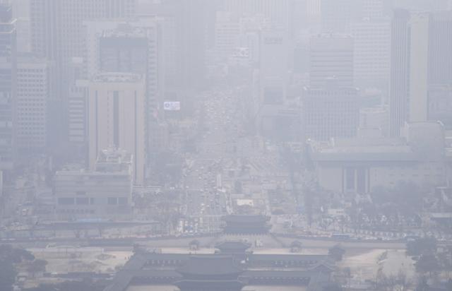 국외 대기오염물질 유입과 국내 대기정체가 반복되면서 수도권에 초미세먼지 주의보가 발령된 15일 서울 북악산에서 바라본 경복궁과 광화문 일대 도심이 희뿌연 미세먼지로 뒤덮여 있다. 이날 수도권은 배기가스 5등급 차량 운행제한, 사업장·공사장 운영단축 조정 등 비상저감조치가 시행됐다. 고영권 기자 *사진은 특정기사와 관련 없음 |