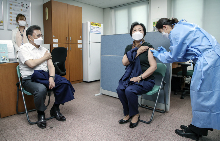 문재인 대통령과 부인 김정숙 여사가 23일 오전 서울 종로구 보건소에서 아스트라제네카(AZ) 백신을 접종했다.