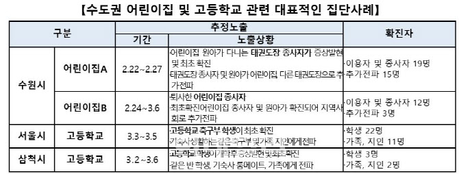 또한, 어린이집 감염사례의 경우 어린이집 내 이용자 및 종사자 집단감염 후 가족·동료들을 통해 지역사회 직장·학원·어린이집에 추가 전파가 이뤄졌다. 대학교의 경우 지인 간 다중이용시설 이용을 통해 전파되거나, 외국인 교환학생으로부터 지인모임을 통해 동료학생으로 추가전파 됐다.