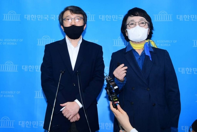 [서울=뉴시스]최동준 기자 = 의원직 사퇴를 선언한 김진애 열린민주당 서울시장 예비후보와 의원직 승계예정자인 김의겸 전 청와대 대변인이 3일 서울 여의도 국회 소통관에서 기자회견 후 취재진 질문에 답변하고 있다. (공동취재사진) 2021.03.03. photo@newsis.com |