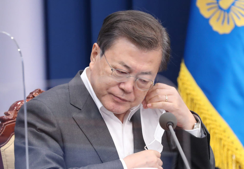 문재인 대통령이 22일 오후 청와대에서 열린 수석·보좌관회의에서 발언을 위해 마스크를 벗고 있다. 연합뉴스 |