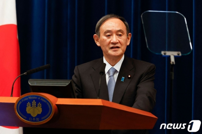 (도쿄 AFP=뉴스1) 우동명 기자 = 스가 요시히데 일본 총리가 18일 (현지시간) 도쿄 총리관저에서 기자회견을 갖고 도쿄 등 수도권 일부 지역에 발효 중인 코로나19 긴급사태를 이달 21일 전면 해제한다고 밝히고 있다. (C) AFP=뉴스1 |