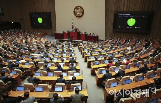 25일 국회 본회의에서 4차 재난지원금 지급을 위한 15조원 규모의 추경안이 통과되고 있다./윤동주 기자 doso7@ |