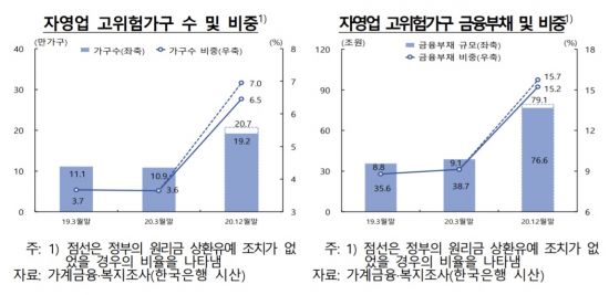 고위험가구가 갖고 있는 금융부채는 76조6000억원으로 금융부채 규모도 2019년 3월 말 35조6000억원에서 지난해 3월 말 38조7000억원, 지난해 말에는 76조6000억원으로 늘었다. 고위험가구가 갖고 있는 부채규모가 약 9개월만에 두 배로 불어난 것이다. 만약 정부의 원리금 상환유예 조치가 없었다면 고위험 가구수는 20만7000가구까지 늘고, 관련 부채도 79조1000억원까지 늘어났을 것으로 한은은 분석했다.