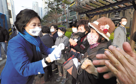 박영선 더불어민주당 서울시장 후보가 25일 오전 서울 구로구 신도림역에서 지지자들과 인사하고 있다. [국회사진기자단] |
