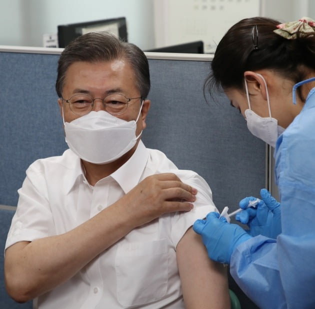 앞서 문 대통령 부부는 지난 23일 오전 9시 종로구보건소에서 AZ 백신 1차 접종을 마쳤다. 이후 녹화 방송으로 공개된 백신 접종 장면에서 간호사는 주사기로 백신을 추츨(분주)한 뒤 가림막(파티션) 뒤로 갔다가 다시 나와 문 대통령에 접종했다.