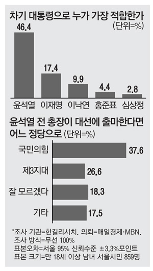 매일경제와 MBN이 한길리서치에 의뢰해 지난 22~23일 서울시민 859명에게 '차기 대선주자 적합도'를 물어본 결과 윤 전 총장이 46.4%로 1위를 차지했다. 지금까지 각종 여론조사에서 집계된 윤 전 총장 지지율 중 가장 높은 수치다. 윤 전 총장이 대선에 출마한다면 국민의힘 후보가 돼야 한다는 응답은 37.6%였고 제3지대 후보로 나와야 한다는 응답은 26.6%로 나타났다. 제1야당인 국민의힘으로 가야 한다는 응답이 10%포인트 이상 높은 셈이다. 잘 모르겠다는 18.3%, 기타는 17.5%로 각각 집계됐다. 여권 주자 가운데는 이재명 지사가 17.4%로 뒤를 이었다. 최근까지 당 대표를 역임한 이낙연 위원장은 지지율이 한 자릿수대인 9.9%로 떨어졌다. 이 밖에 홍준표 무소속 의원 4.4%, 심상정 정의당 의원 2.8%, 유승민 전 국민의힘 의원 2.1% 순이었다. 서울시민을 대상으로 한 여론조사는 표본오차 95%에 신뢰수준 ±3.3%포인트다.